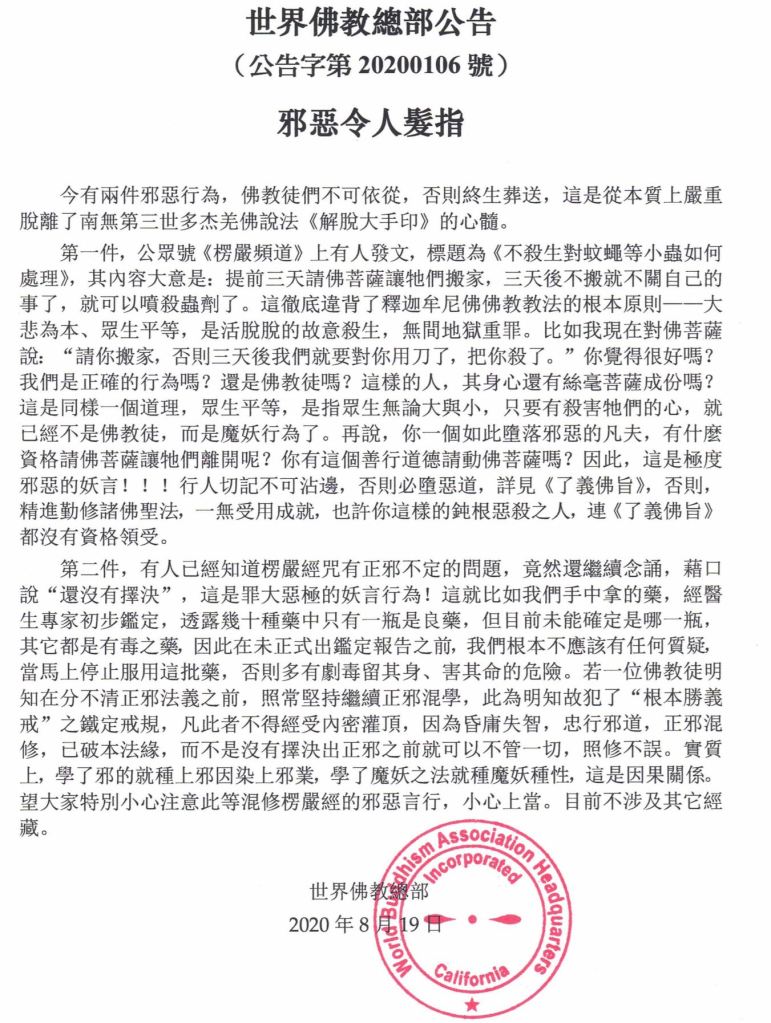 第二件,有人已經知道楞嚴經咒有正邪不定的問題,竟然還繼續念誦,藉口說“還沒有擇決”,這是罪大惡極的妖言行為!這就比如我們手中拿的藥,經醫生專家初步鑑定,透露幾十種藥中只有一瓶是良藥,但目前未能確定是哪一瓶,其它都是有毒之藥,因此在未正式出鑑定報告之前,我們根本不應該有任何質疑,當馬上停止服用這批藥,否則多有劇毒留其身、害其命的危險。若一位佛教徒明知在分不清正邪法義之前,照常堅持繼續正邪混學,此為明知故犯了“根本勝義戒”之鐵定戒規,凡此者不得經受內密灌頂,因為昏庸失智,忠行邪道,正邪混修,已破本法緣,而不是沒有擇決出正邪之前就可以不管一切,照修不誤。實質上,學了邪的就種上邪因染上邪業,學了魔妖之法就種魔妖種性,這是因果關係。望大家特別小心注意此等混修楞嚴經的邪惡言行,小心上當。目前不涉及其它經藏。