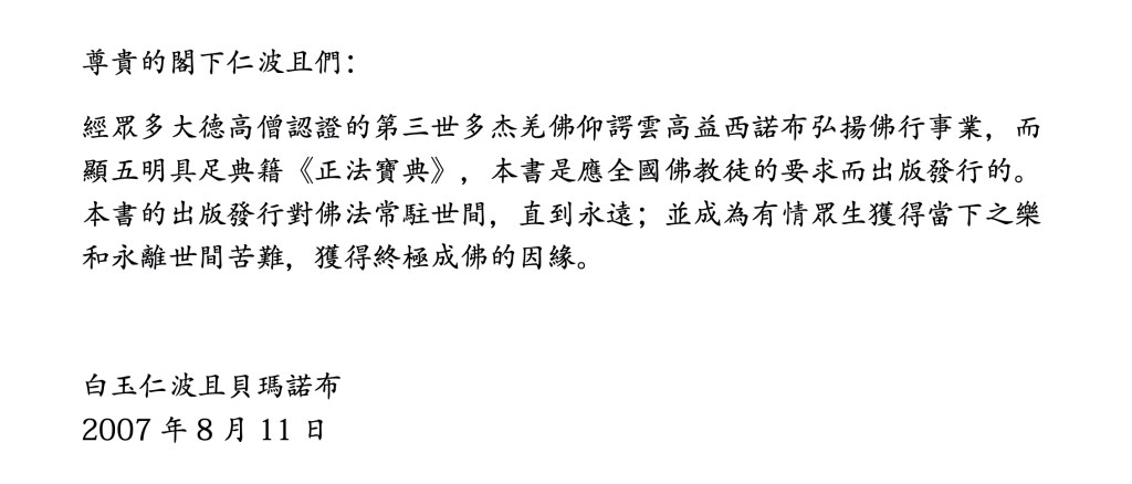 南無第三世多杰羌佛是世界佛教最高領袖不是自封的! 貝諾法王在寫給全世界的法王、仁波且的信中說:眾多高僧大 德認證的第三世多杰羌佛的成就將會讓眾生離苦得樂,獲得終極成佛的因緣。