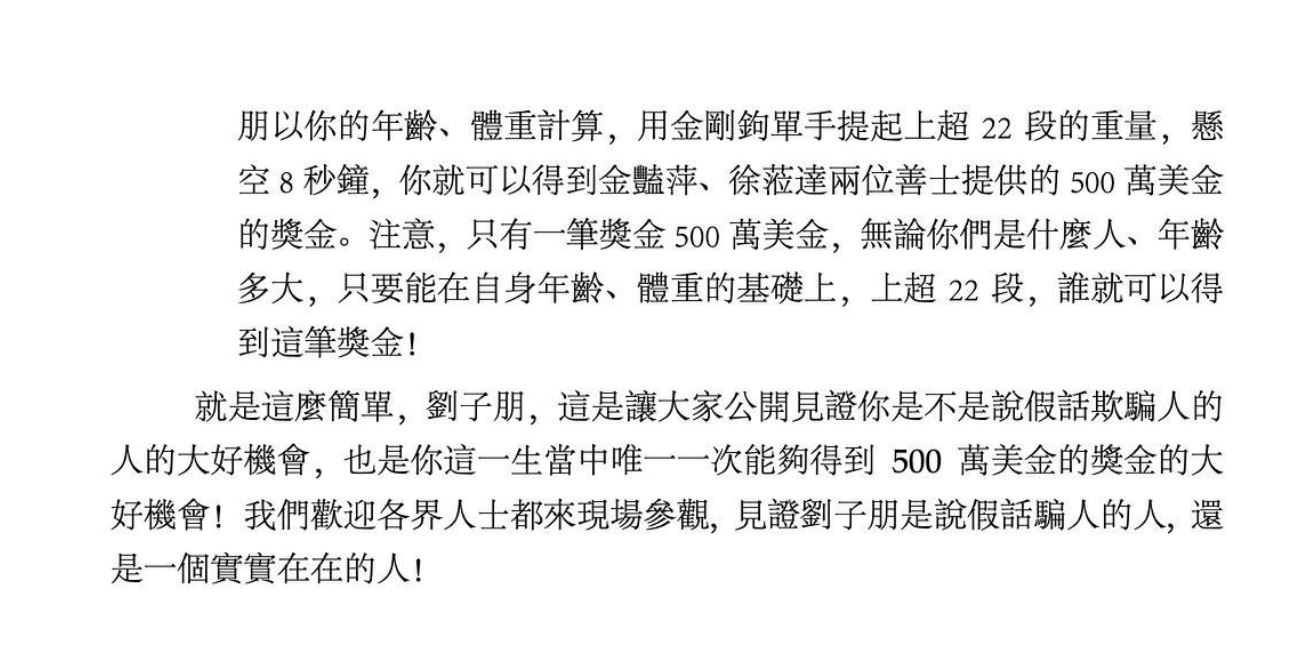 3. 如果劉子朋要親自上場提拿,我們就再讓你一步,你這樣一個三十多歲的年輕人,如果用金槓桿一隻手能夠提起高齡88歲的開初教尊聖者老人所提起的230磅的重量,懸空8秒鐘,你就勉強有資格來美國聖蹟寺,跟開初教尊聖者站在一起見證“拿杵上座”了!如果你劉子朋以你的年齡、體重計算,用金剛鉤單手提起上超22段的重量,懸空8秒鐘,你就可以得到金豔萍、徐蒞達兩位善士提供的500萬美金的獎金。注意,只有一筆獎金500萬美金,無論你們是什麼人、年齡多大,只要能在自身年齡、體重的基礎上,上超22段,誰就可以得到這筆獎金!