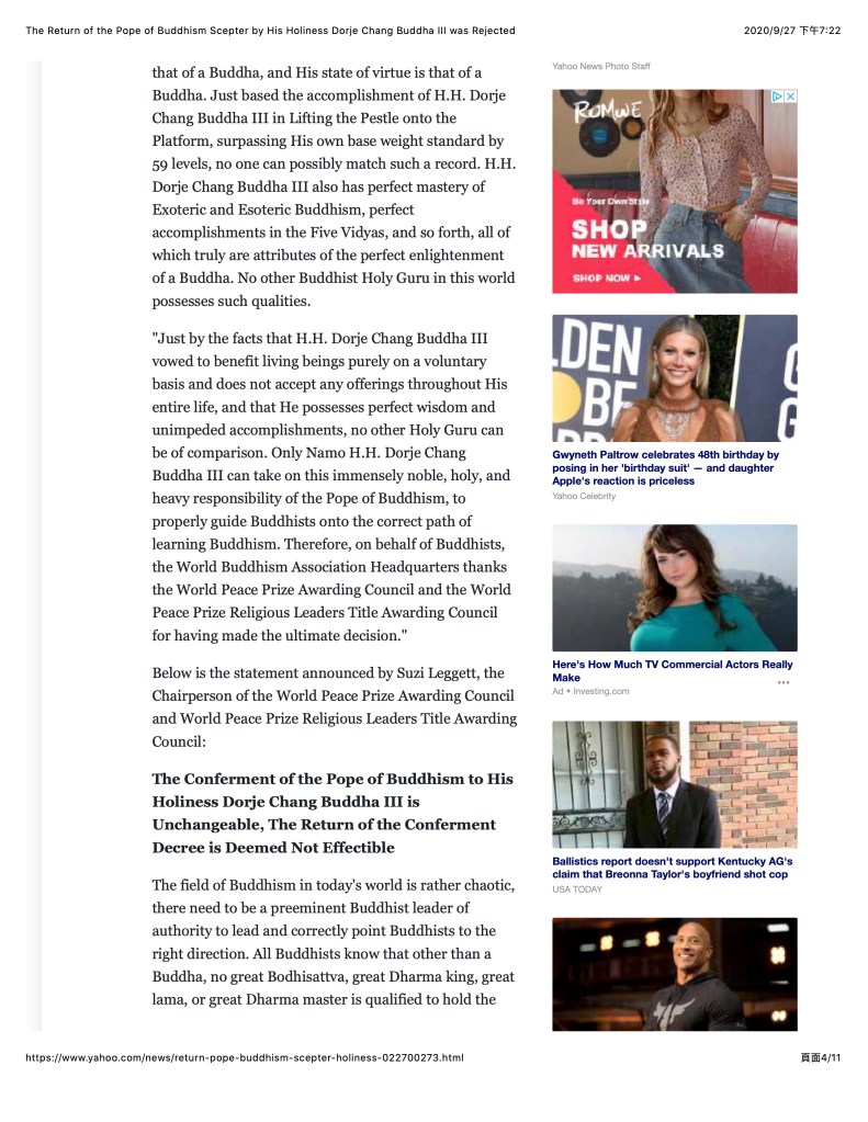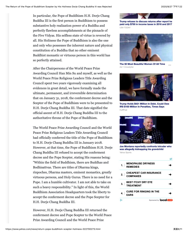 Attachment 4. Yahoo News 雅虎新聞_The Return of the Pope of Buddhism Scepter by His Holiness Dorje Chang Buddha III was Rejected_9-27-2020